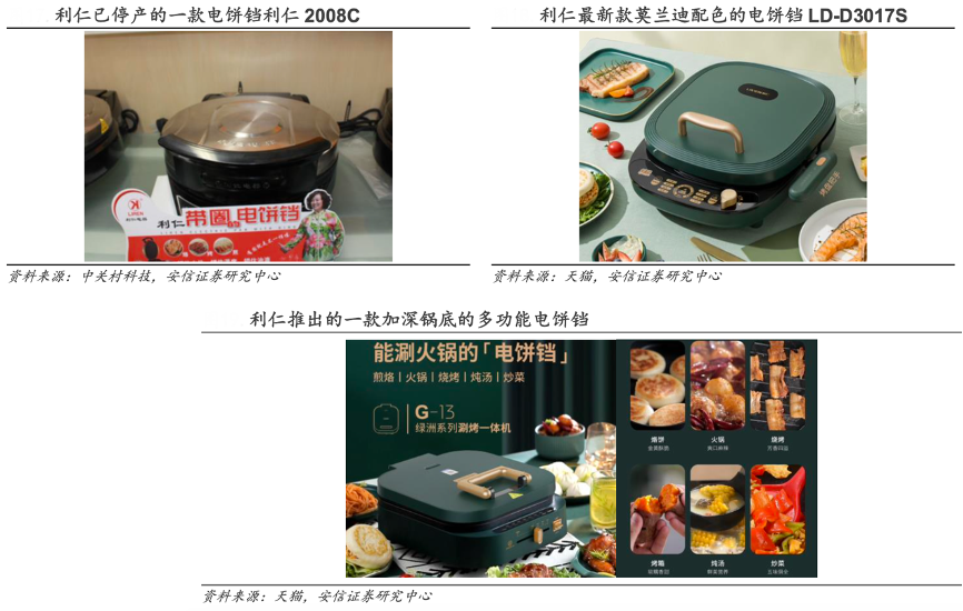 經(jīng)典案例:根據(jù)中關(guān)村科技、天貓、安信證券研究中心等綜合資訊表明,利仁電餅鐺功能不斷豐富,外形設(shè)計更加年輕時尚。在 2010 年之后,上下餅盤的深度被加深,也多被設(shè)計為可拆卸的模式,以適應(yīng)煎煮等多種烹飪形式。產(chǎn)品開始朝多功能的方向發(fā)展,制作的食物種類也開始多樣化。除了功能上的改進(jìn),電餅鐺的外觀設(shè)計上也逐漸趨向年輕化,部分 產(chǎn)品顏色為更年輕時尚的莫蘭迪配色,和吸引年輕女性的萌系配色。
