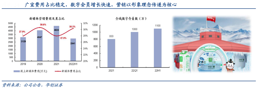 經(jīng)典案例:根據(jù)公司公告、華創(chuàng)證券等綜合資訊表明,新乳業(yè)線上新媒體費(fèi)用支出不斷提升,占廣宣費(fèi)用比例較為穩(wěn)定,2019-2022H1 均在 30%左右。截止 22H1,新乳業(yè)全域數(shù) 字化用戶突破 1100 萬人,半年內(nèi)新轉(zhuǎn)化超過300 萬全域數(shù)字會員。新乳業(yè)聯(lián)名中國極地科考隊,傳遞以“極質(zhì)”的鮮活提供更好健康營養(yǎng)的理念,以“極地精神”強(qiáng)化公司精益求精的形象。