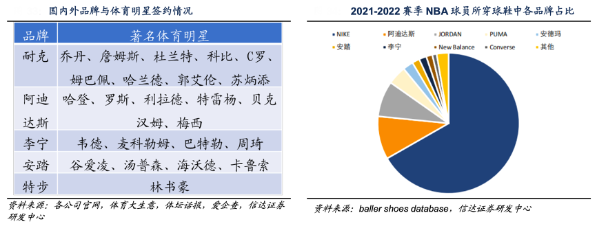 經(jīng)典案例:根據(jù)各公司官網(wǎng)、體育大生意、體壇話報、愛企查、baller shoes database、信達(dá)證券研發(fā)中心等綜合資訊表明,本土品牌持續(xù)升級營銷資源,李寧、安踏品牌分別在 2012 和 2015 年簽下 NBA 知名球 星德維恩·韋德和全明星后衛(wèi)克萊·湯普森,并推出個人系列籃球鞋,提升本土運(yùn)動品牌在國內(nèi)外專業(yè)運(yùn)動愛好者的影響力。