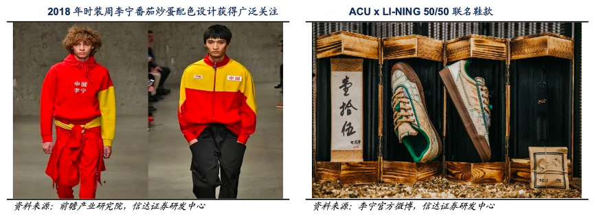 經(jīng)典案例:根據(jù)前瞻產(chǎn)業(yè)研究院、李寧官方微博、信達(dá)證券研發(fā)中心等綜合資訊表明,李寧公司以接近設(shè)計師品牌的運(yùn)作模式,重視原創(chuàng)設(shè)計理念,將運(yùn)動基因與中國文化、潮流元素相融合,2018年憑借“番茄炒蛋色”的獨(dú)特設(shè)計,打破國內(nèi)運(yùn)動服飾的刻板印象,成為新 國潮的象征。2022年初公司與 ACU 合作推出的 ACU x LI-NING 50/50 聯(lián)名鞋款融入中醫(yī)文 化元素,以中醫(yī)中所用的中藥材作為其主要設(shè)計理念,將中國傳統(tǒng)文化與西方街頭潮流運(yùn)動文化相結(jié)合,以創(chuàng)新的理念詮釋國潮風(fēng)。