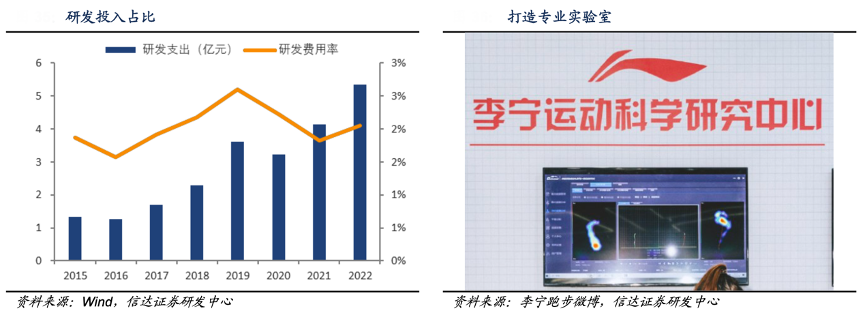 經(jīng)典案例:根據(jù)wind、李寧跑步微博、信達(dá)證券研發(fā)中心等綜合資訊表明,近年來(lái)李寧公司研發(fā)支出持續(xù)增長(zhǎng),2022 年公司研發(fā)費(fèi)用為 5.34 元,同增 28.99%,研發(fā)費(fèi)用增幅超過營(yíng)收。公司重視運(yùn)動(dòng)科 學(xué)領(lǐng)域研究,2008 年創(chuàng)立李寧運(yùn)動(dòng)科學(xué)研究中心,配備科研級(jí)別實(shí)驗(yàn)設(shè)備,下設(shè)運(yùn)動(dòng)生物力學(xué)、鞋機(jī)械測(cè)試以及腳型實(shí)驗(yàn)室,為產(chǎn)品研發(fā)提供技術(shù)保障和科學(xué)依據(jù)。依托于對(duì)產(chǎn)品科技的持續(xù)投入,公司擁有多項(xiàng)鞋履核心技術(shù),相繼開發(fā)出“李寧云”、“李寧弜”、 “Light Foam”和“李寧?”等多種中底材料和科技,提升運(yùn)動(dòng)鞋緩震、回彈、輕量性。