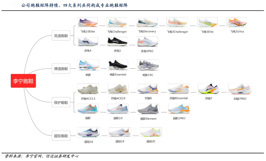 經(jīng)典案例:根據(jù)李寧官網(wǎng)、信達(dá)證券研發(fā)中心等綜合資訊表明,李寧公司聚焦專業(yè)跑鞋的技術(shù)研發(fā)和性能優(yōu)化,持續(xù)擴(kuò)充專業(yè)跑鞋矩陣,并進(jìn)行產(chǎn)品迭代。大眾休閑方面,公司李寧嵐、云雀覆蓋業(yè)余跑者慢跑等日常運(yùn)動(dòng)需求;專業(yè)跑步方面,公司六大跑鞋家族(飛電、絕影、赤兔、超輕、烈駿、越影)可以覆蓋競速、競訓(xùn)、緩震保護(hù)、超輕支撐運(yùn)動(dòng)場景,矩陣覆蓋群體從初級(jí)到專業(yè)跑者,助力消費(fèi)者提升運(yùn)動(dòng)表現(xiàn)。