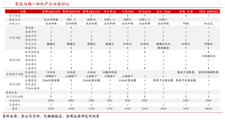 經(jīng)典案例:根據(jù)各公司官網(wǎng)、天貓旗艦店、、浙商證券研究所等綜合資訊表明,“功能”是影響消費(fèi)者智能馬桶購買決策的第一要素。目前功能配置上,國產(chǎn)主流品牌已跟外資相近,從水壓控制、沖洗功能、清洗清潔、除臭烘干、座圈加熱、用戶記憶、安全防護(hù)、光感夜燈等功能都已備齊。這與國貨持續(xù)的研發(fā)投入相關(guān),2021 年箭牌研發(fā)費(fèi)用支出 2.88 億元,研發(fā)費(fèi)用 率 3.44%,惠達(dá)衛(wèi)浴研發(fā)費(fèi)用支出 1.67 億元,研發(fā)費(fèi)用率 4.29%。