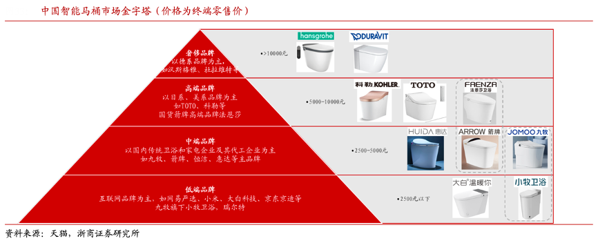 經(jīng)典案例:根據(jù)天貓、浙商證券研究所等綜合資訊表明,以智能一體機(jī)為例,主流價(jià)格帶上,科勒和東陶TOTO 普遍在 1 萬元以上,內(nèi)資品牌箭牌家居、恒潔、九牧在 2500-4500 元左右,近年通過子品牌同時(shí)向 1 萬+和中低端。箭牌在 2500-4500 價(jià)格帶占優(yōu),推出三大品牌覆蓋不同價(jià)格帶,F(xiàn)AENZA 法恩莎定位高端藝術(shù)家居(3500-6000 元),主品牌 ARROW 箭牌定位智慧家居(主流定價(jià) 2500-3500 元),ANNWA 安華定位時(shí)尚家居 (主流定價(jià) 2500-4000 元),其中箭牌 AKB1520 定價(jià)萬元以上。