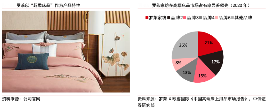 經(jīng)典案例:根據(jù)公司官網(wǎng)、羅萊*歐睿國際《中國高端床上用品市場報(bào)告》、中信證券研究部等綜合資訊表明,羅萊的行業(yè)龍頭地位穩(wěn)固,品牌形象深入人心。2019年羅萊品牌總知名度 78.7%、滿意度達(dá)到 98.1%,比上年提升 3.8%,品牌具有較高的知名度與美譽(yù)度。根據(jù)羅萊與歐睿國際聯(lián)合發(fā)布的《中國高端床上用品市場報(bào)告》,2020年中國高端床品市場 CR5 達(dá)到 74%,其中羅萊以 21% 的份額穩(wěn)居行業(yè)第一。