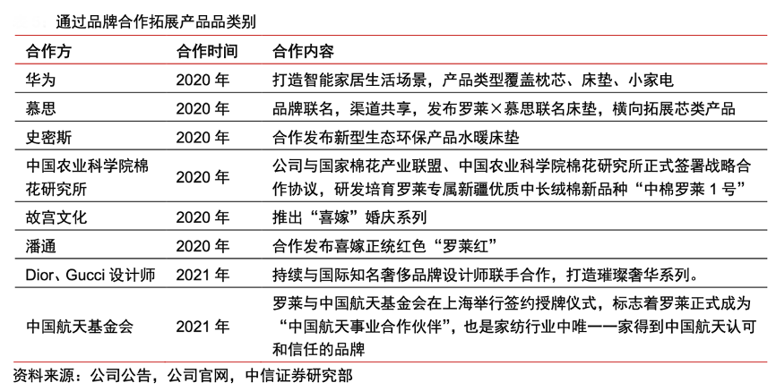 經(jīng)典案例:根據(jù)公司公告、公司官網(wǎng)、中信證券研究部等綜合資訊表明,2020 年起羅萊家紡加大與知名品牌的合作力度,拓展產(chǎn)品種類,增強品牌聲量。例如與華為 HiLink 開啟合作,攜手打造智能生活場景下的 新智能產(chǎn)品系列,覆蓋枕芯、床墊、小家電等;與高端熱水器品牌史密斯合作發(fā)布新型生態(tài)環(huán)保產(chǎn)品 水暖床墊;與 Dior、Gucci 等國際知名奢侈品牌設(shè)計師聯(lián)手合作,打造璀璨奢華系列。