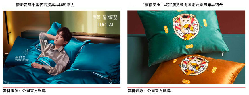 經(jīng)典案例:根據(jù)公司官方微博、中信證券研究部等綜合資訊表明,羅萊流量代言人結(jié)合國潮元素注入年輕活力。2020年 10 月,羅萊選擇易烊千璽為品牌形 象代言人,通過代言人的溫潤氣質(zhì)傳遞品牌超柔定位,并有效提升品牌流量與拉新能力。羅萊·粹系列與故宮文化合作,將當代年輕人喜愛的國潮元素融入床品設(shè)計,在簡約高雅的同時蘊含吉祥寓意,為品牌注入年輕活力。