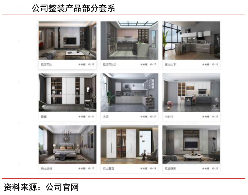 經(jīng)典案例:根據(jù)公司官網(wǎng)、中信證券研究部等綜合資訊表明,以志邦品牌拓展整裝模式,并通過產(chǎn)品體系重構(gòu),將原 IK 品牌產(chǎn)品融入整裝渠道,并針對(duì)性開發(fā)符合裝企風(fēng)格的套系化產(chǎn)品,官網(wǎng)顯示已有輕奢、 簡(jiǎn)中風(fēng)格、簡(jiǎn)美風(fēng)格、簡(jiǎn)約風(fēng)格 4 個(gè)類型共 17 套產(chǎn)品。