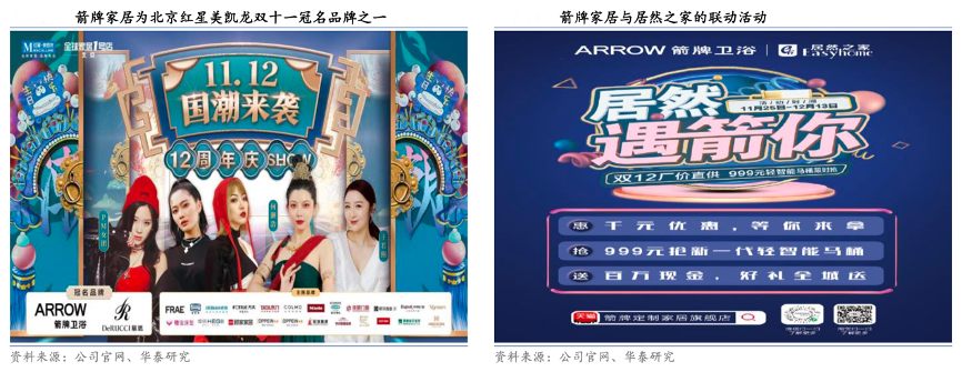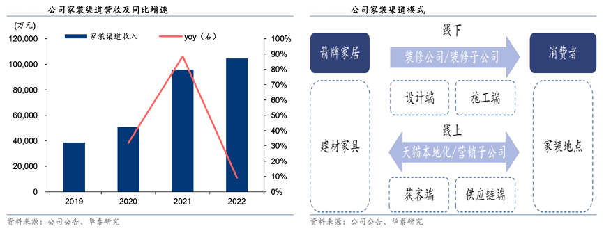 經(jīng)典案例:根據(jù)公司公告、華泰研究等綜合資訊表明,箭牌家居公司積極拓展家裝渠道,與全國性頭部家裝公司達(dá)成戰(zhàn)略合作并由各地經(jīng)銷商落地實(shí)施,同時,公司各區(qū)域服務(wù)人員協(xié)同經(jīng)銷商開展“家裝城市合伙人”等活動以開拓當(dāng)?shù)刂行∥⒓已b企業(yè),并提供專項(xiàng)產(chǎn)品方案。2022年,公司家裝渠道實(shí)現(xiàn)營收 10.5 億元,同比+9.2%;占總收入13.9%,同比+2.5pct。