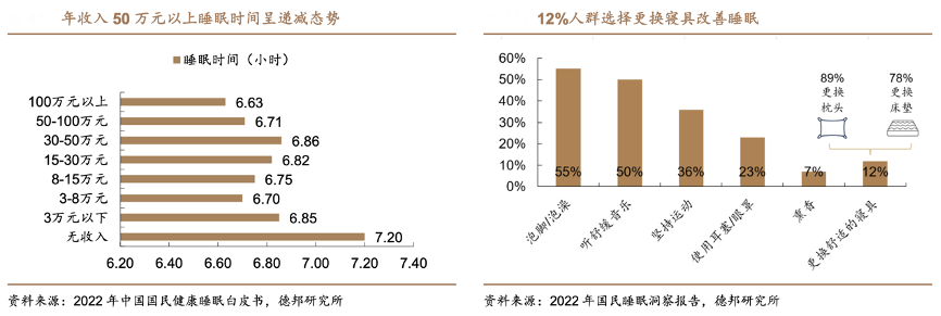 經(jīng)典案例:根據(jù)根據(jù)《2022 年國(guó)民睡眠洞察報(bào)告》、德邦研究所等綜合資訊表明,床墊行業(yè)的消費(fèi)群體主要包括個(gè)人住房、酒店和醫(yī)院等,個(gè)人住房消費(fèi)床墊需求占市場(chǎng)需求比重大, 2012-2021 年國(guó)內(nèi)人均睡眠時(shí)間從 8.5 小時(shí)下降至 7.06 小時(shí),睡覺時(shí)長(zhǎng)減少接近 1.5 小時(shí)。根據(jù)《2022 年國(guó)民睡眠洞察報(bào)告》,85%的國(guó)民有改善睡眠質(zhì)量需求,包括內(nèi)在的養(yǎng)成良好習(xí)慣和外在的改善睡眠環(huán)境,直接改善睡眠環(huán)境包括使用耳塞/眼罩、更換寢具、使用熏香等,更換寢具中約有 78% 選擇更換床墊,由此帶來助睡眠類產(chǎn)品需求潛力巨大,潛在睡眠改善需求為床墊行業(yè)發(fā)展提供驅(qū)動(dòng)力。