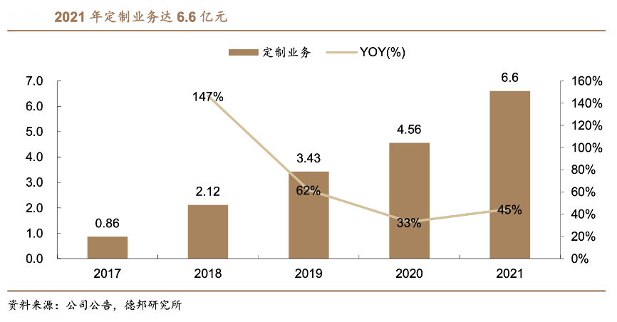 經(jīng)典案例:根據(jù)公司公告、德邦研究所等綜合資訊表明,顧家家居公司于 2016 年 4 月成立顧家定制,從事定制家居的生產(chǎn)、設(shè)計(jì)與銷售,為客戶提供全屋解決方案,定制業(yè)務(wù)是公司戰(zhàn)略布局的重要一步,進(jìn)一步豐富了顧家全屋的業(yè)態(tài)。2021 年定 制業(yè)務(wù) 6.6 億元,自 2017 年以來,定制家居業(yè)務(wù)快速增長(zhǎng)態(tài)勢(shì),2017-2021 年 CAGR 達(dá)66.4%。