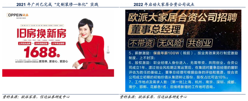 經(jīng)典案例:根據(jù)歐派家居、信達證券研發(fā)中心等綜合資訊表明,歐派家居在公司多品類、多渠道合力之下,2021年“定制裝修一體化”的大家居模式在廣分試點先行。從廣州的試點模式來看,廣州分公司通過整合體系內(nèi)外資源給消費者提供一站式服務(wù),即通過與當(dāng)?shù)匮b修公司合作,由他們提供硬裝、主材等,歐派提供定制化產(chǎn)品,再整合瓷磚、 吊頂?shù)戎放?,為消費者提供拆除、租房、搬家、倉儲等一站式的“舊房變新房”服務(wù)。 2022 年,從大家居合資公司的試點城市來看,也是以大商為主。