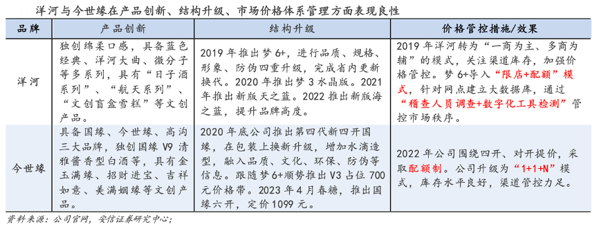 經(jīng)典案例:根據(jù)公司官網(wǎng)、安信證券研究中心等綜合資訊表明,江蘇市場本地酒企優(yōu)勢明顯,在香型口感、渠道基礎(chǔ)方面具備壁壘,消費(fèi)者對地產(chǎn)品牌認(rèn)知度高。2019 年 11 月,搭乘蘇酒消費(fèi)升級之風(fēng), 洋河推出夢 6+,搶占 600 元價(jià)格帶。通過組織改革、渠道梳理、控價(jià)控貨、消費(fèi)者掃碼應(yīng) 紅包活動等在省內(nèi)迅速鋪貨放量。隨后陸續(xù)推出夢 3 水晶版、新版天之藍(lán)、新版海之藍(lán)進(jìn) 行產(chǎn)品結(jié)構(gòu)升級。今世緣則在 2016 年發(fā)力國緣開系,實(shí)現(xiàn)大單品化。