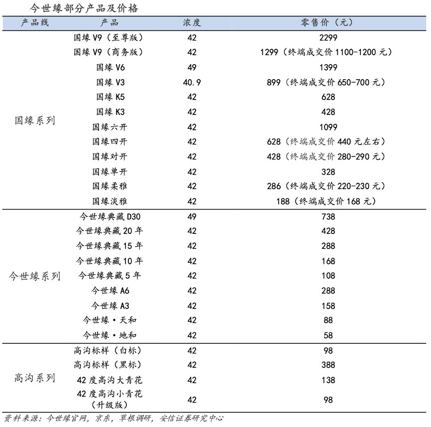 經(jīng)典案例:根據(jù)今世緣官網(wǎng)、京東、草根調(diào)研、安信證券研究中心等綜合資訊表明,今世緣公司有國緣、今世緣、高 溝三大 白酒品 牌,分 別定位于 高端與次高端、中端、低端。公司產(chǎn)品結(jié)構(gòu)持續(xù)優(yōu)化,中高端以上產(chǎn)品表現(xiàn)亮眼,2022 年 公司特 A+類產(chǎn)品實(shí)現(xiàn)營業(yè)收入 51.97 億元(+24.78%),營收占比由 2016 年的 36.82%提升 至 65.92%,主要由國緣 V 系、開系拉動。2023 年春糖,公司在四開基礎(chǔ)上進(jìn)一步延伸,發(fā) 布新品柔 雅兼香 型白 酒國緣 六開。