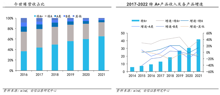 經(jīng)典案例:根據(jù)wind、安信證券研究中心等綜合資訊表明,今世緣公司有國緣、今世緣、高溝三大白酒品牌,分別定位于高端與次高端、中端、低端。公司產(chǎn)品結(jié)構(gòu)持續(xù)優(yōu)化,中高端以上產(chǎn)品表現(xiàn)亮眼,2022 年 公司特 A+類產(chǎn)品實(shí)現(xiàn)營業(yè)收入 51.97 億元(+24.78%),營收占比由 2016 年的 36.82%提升 至 65.92%,主要由國緣 V 系、開系拉動。