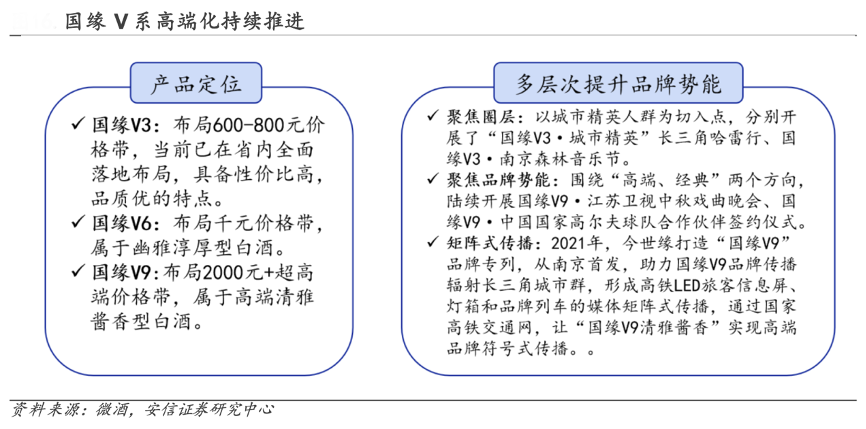 經(jīng)典案例:根據(jù)微酒、安信證券研究中心等綜合資訊表明,今世緣公司在高端市場國緣 V 系布局清晰:其中V3、 V6 為幽雅醇厚型白酒,V9 為清雅醬香型白酒,V 系列定位超高端,V3 卡位 600 元+,V6 卡 位千元之上,V9 定價(jià) 2000 元以上,定位超高端,公司采取“V9 做形象、V3 做銷量、V6 做補(bǔ)充”的差異化布局。