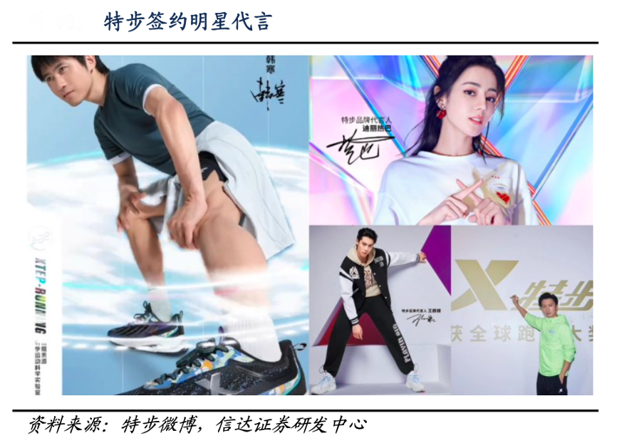 經(jīng)典案例:根據(jù)特步微博、信達(dá)證券研發(fā)中心等綜合資訊表明,特步公司通過簽約明星以持續(xù)傳播品牌知名度,簽約明星包括王鶴棣、迪麗熱巴、范丞丞、謝霆鋒、韓寒等。2021年特步攜迪麗熱巴推出首個(gè)女子系列“半糖”,激勵(lì)女性自信地展示真實(shí)自我,宣示獨(dú)特的自我主張,為品牌轉(zhuǎn)型升級(jí)創(chuàng)造長期勢(shì)能。公司還以“特步特不服”為題贊助《中國新說唱》、《這就是街舞》和《明日之子》等節(jié)目,擺脫刻板印象,邁向品牌年輕化、潮流化。
