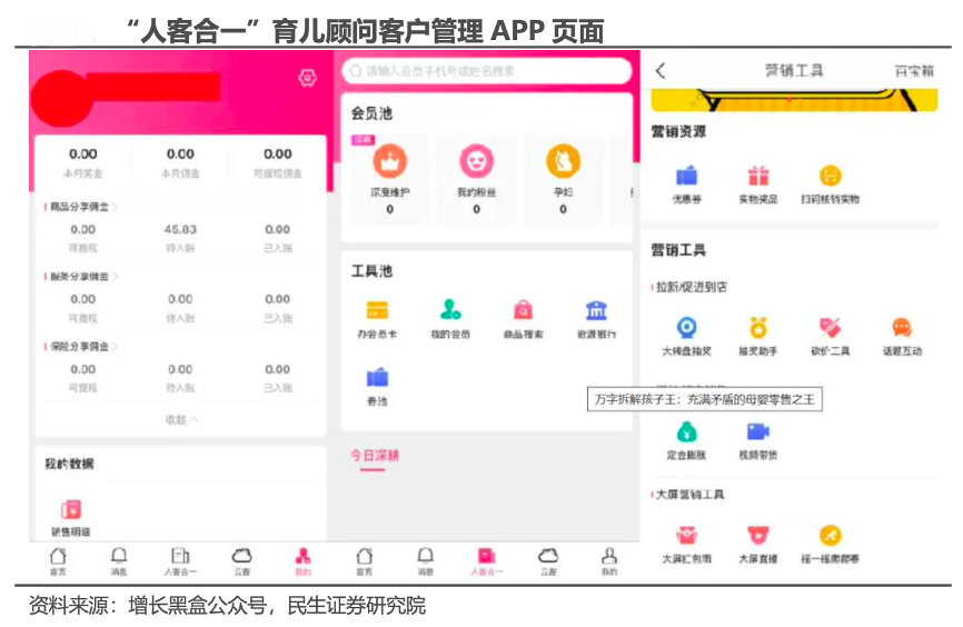 經(jīng)典案例:根據(jù)增長黑盒公眾號、民生證券研究院等綜合資訊表明,為賦能員工進行高效而精準的客戶服務(wù)和管理,孩子王公司開發(fā)了 “人客合一”育兒顧問客戶管理工具、“云客 合一”、“阿基米德”店總經(jīng)營管理工具等,其中,“人客合一”集經(jīng)營分析、社群工具、門店工具、掃碼購工具、育兒服務(wù)、互動活動、日常辦公、巡店等 11 大模塊為一體,可基于前端對用戶的行為特征與購物服務(wù)需求的分析結(jié)果,將人工點對點的服務(wù)需求自動推送到每一個對應(yīng)員工,助力員工進行個性化、精準化營銷,提升服務(wù)效率。