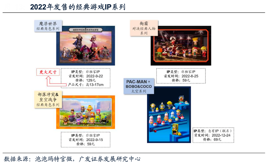 經(jīng)典案例:根據(jù)泡泡瑪特官微、廣發(fā)證券發(fā)展研究中心等綜合資訊表明,泡泡瑪特盲盒的消費(fèi)者畫像以女性用戶為主。為更好滿足男性用戶消費(fèi)偏好,公司在2022年上線 幾款經(jīng)典游戲IP,包括魔獸世界、街頭霸王、部落沖突&皇室戰(zhàn)爭以及PAC-MAN等。