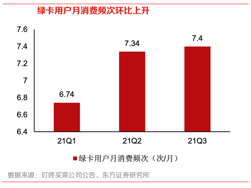 經(jīng)典案例:根據(jù)叮咚買菜公司公告、東方證券研究所等綜合資訊表明,從業(yè)務數(shù)據(jù)來看,其綠卡用戶的消費頻次21Q2 明顯上升,且高于用戶平均消費頻次。21Q2 叮咚買菜綠卡會員消費頻次達到 7.34 次/月,顯著高于用戶平均消費頻次,環(huán)比增加 0.6 次,有明顯提升。