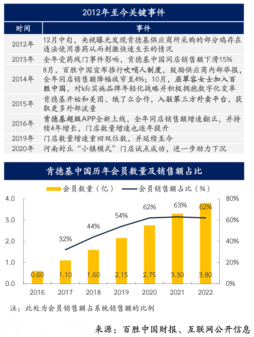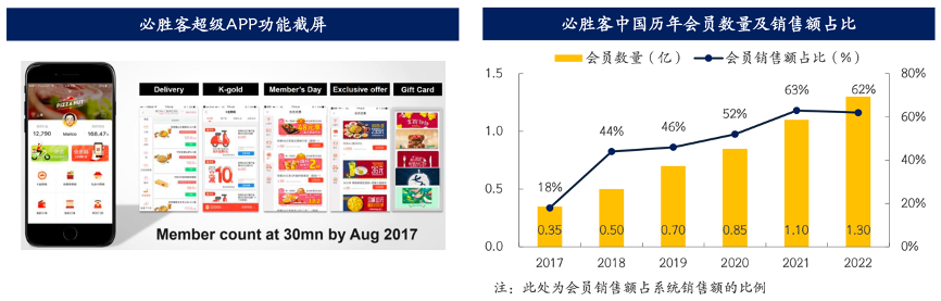 經(jīng)典案例:根據(jù)百勝中國財(cái)報(bào)、投資者交流材料、弘則研究等綜合資訊表明,2017年6月必勝客發(fā)布超級APP,并隨后將外送、自助點(diǎn)餐功能整合起來,同時(shí)引入會(huì)員體系,在超級APP上發(fā)布會(huì)員日活動(dòng)并推薦會(huì)員專屬產(chǎn)品。2022年必勝客會(huì)員數(shù)量達(dá)到1.3 億,會(huì)員銷售額占比達(dá)到62%,有利于提升粘性促進(jìn)復(fù)購。