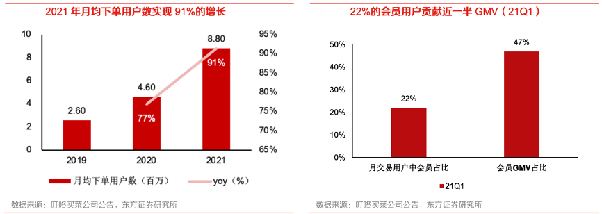 經(jīng)典案例:根據(jù)叮咚買菜公司公告、東方證券研究所等綜合資訊表明,趨勢對比來看,叮咚買菜 2021 年月均下單用戶突破 880 萬,同比實現(xiàn)了 91%的增長?;跁T群體具有高價值和稀缺性 的屬性,其訂單貢獻量遠高于普通用戶。2021Q1 叮咚買菜會員用戶占總用戶比例 22%,貢獻了 47%的 GMV。