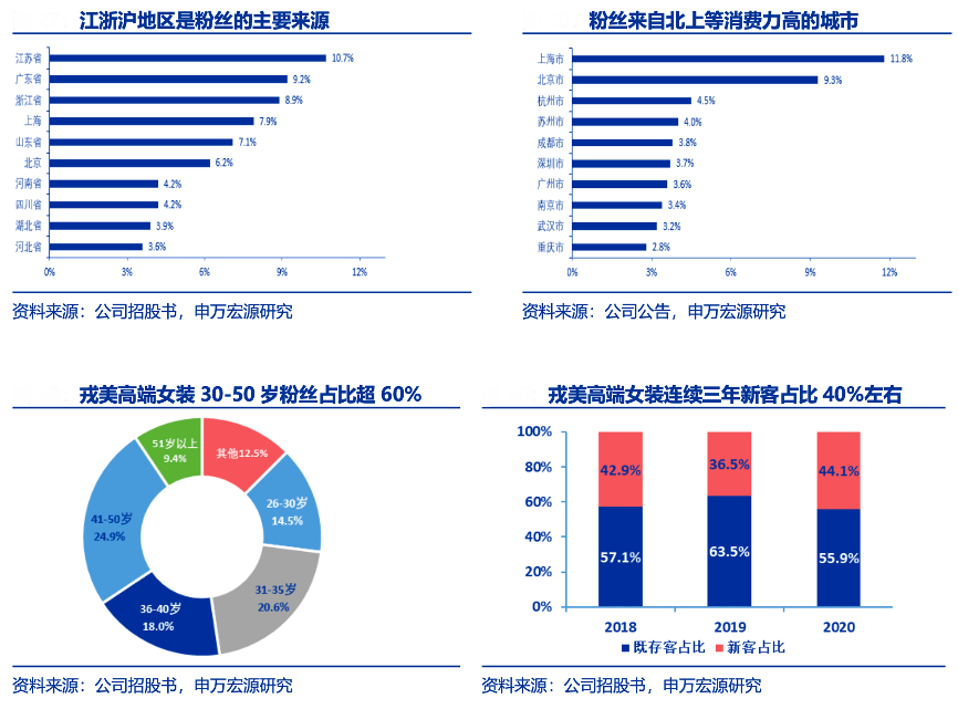 經(jīng)典案例:根據(jù)公司招股書、公司公告、申萬宏源研究等綜合資訊表明,截至 2020 年 12 月 31 日戎美高端女裝粉絲各年齡段均有分布,其中 30-50 歲“輕熟”、“知性”女性占比超 60%。粉絲主要分布于華東、華北和華南等消費人口較多、經(jīng)濟較為發(fā)達地區(qū)。江浙滬三地占比超過 25%,按城市劃分,上海是最大的粉絲來源地,粉絲占比超 10%。