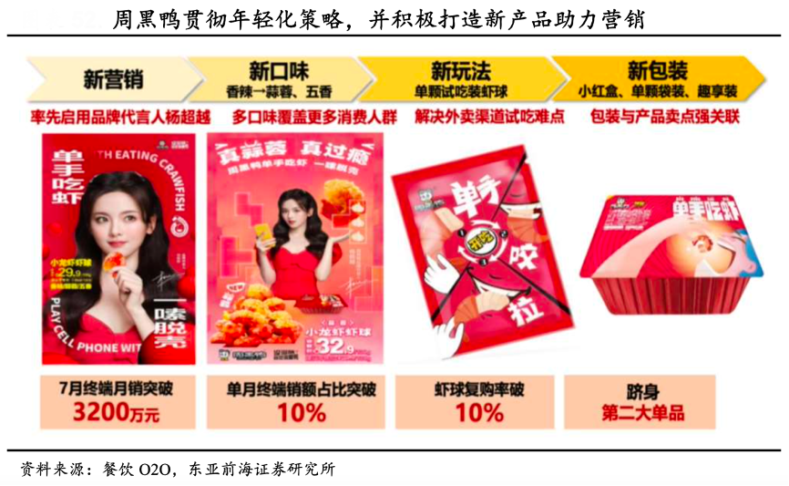 經(jīng)典案例:根據(jù)餐飲O2O、東亞前海證券研究所等綜合資訊表明,2022 年周黑鴨啟用楊超越為品牌形象代言人,貫徹年輕化營銷策略,并成立“內(nèi)容推廣 中心”,借助抖音、小紅書等短視頻、直播平臺,豐富內(nèi)容營銷矩陣,幫助 在新世代消費者群體中建立年輕時尚的品牌形象。