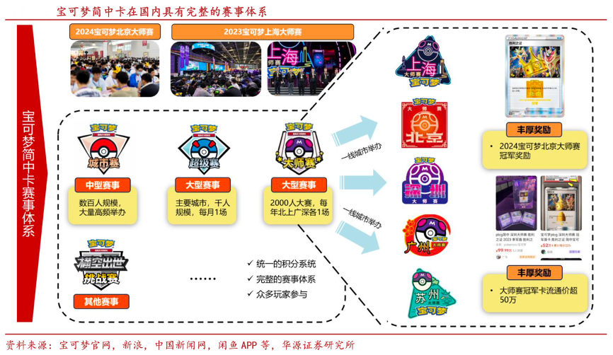 經(jīng)典案例:根據(jù)寶可夢(mèng)官網(wǎng)、新浪、中國(guó)新聞網(wǎng)、閑魚(yú)APP、華源證券研究所等綜合資訊表明,寶可夢(mèng)卡牌大力投入國(guó)內(nèi)賽事,形成完備的賽事體系。2023 年,寶可夢(mèng)卡牌在全國(guó)各大城市舉辦了一系列賽事,短時(shí)間內(nèi)形成了完備的賽事體系。大型賽事包括超級(jí)賽和大師賽,超級(jí)賽在重點(diǎn)城市舉辦,如青島、廈門和成都,人數(shù)規(guī)模在千人左右,幾乎每月都有一場(chǎng)。大師賽每年在北上廣深各 舉辦一場(chǎng),人數(shù)規(guī)模在千人以上,各地高手匯聚一堂,是最高等級(jí)的賽事。
