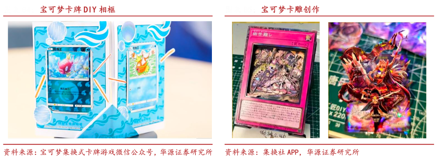 經(jīng)典案例:根據(jù)寶可夢(mèng)集換式卡牌游戲微信公眾號(hào)、集換社APP、華源證券研究所等綜合資訊表明,除卡牌本身外,寶可夢(mèng)卡牌衍生出更加多元的藝術(shù)表達(dá)。除了卡套和收納盒等傳統(tǒng)的收納、展示方式外,玩家通過(guò) DIY 的方式制作卡牌相框,亦或是基于卡牌本身的卡雕創(chuàng)作等。卡雕即采用卡牌作為材料,通過(guò)特殊手法做出紙浮雕的效果的手工作品。