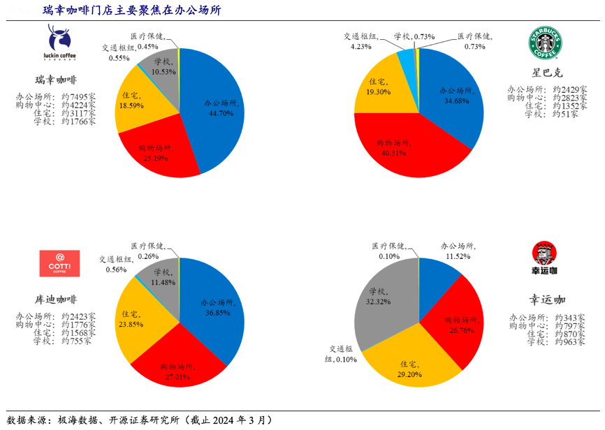 經(jīng)典案例:根據(jù)極海數(shù)據(jù)、開源證券研究所等綜合資訊表明,瑞幸咖啡通過性價(jià)比和快咖啡優(yōu)勢,精準(zhǔn)聚焦咖啡需求較高的白領(lǐng)辦公人群,目前辦公場所門店超 7000 家,占比總門店數(shù)量 44.7%,在辦公場所的競爭優(yōu)勢明顯領(lǐng)先于其他競品。