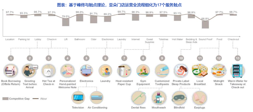 經(jīng)典案例:根據(jù)公司招股書、國海證券研究所等綜合資訊表明,亞朵服務以峰終觸點為底層理論,將門店從預定到退房的運營全流程細分為17個服務觸點,為用戶提供了遠超同行的入住體驗,根據(jù)Brand Wisdom調(diào)研數(shù)據(jù)顯示,亞朵在17個觸點中均獲得行業(yè)最高的用戶好評率。
