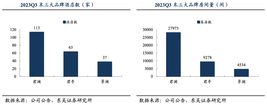 經(jīng)典案例:根據(jù)公司公告、東吳證券研究所等綜合資訊表明,君亭君瀾旗下包含“君瀾大飯店”、“君瀾度假酒店”以及“君瀾理”,領(lǐng)銜高端度假、商旅酒店行業(yè)。景瀾源于君瀾,定位中高端社區(qū)生活酒店,發(fā)展出“景瀾酒店”、“景瀾度假”以及“景瀾青棠”。截至 2023 年 Q3 末,君瀾、君亭與景瀾開業(yè)酒店數(shù)分別為 113/63/37 家,房間數(shù)分別為 27973/9278/4534 間。三大品牌定位互補,深耕高端度假與商旅酒店市場。