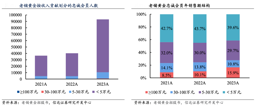 經(jīng)典案例:根據(jù)老鋪黃金招股書、信達證券研究開發(fā)中心等綜合資訊表明,老鋪黃金忠誠會員人數(shù)快速增長,高級別會員銷售貢獻持續(xù)提升。2023 年,在老鋪黃金購買至少一次的忠誠會員人數(shù)翻倍以上增長,達到 9.3 萬人,同比增幅 131%。其中,年消費額 100 萬 元及以上的忠誠會員貢獻了公司 15.9%的收入。