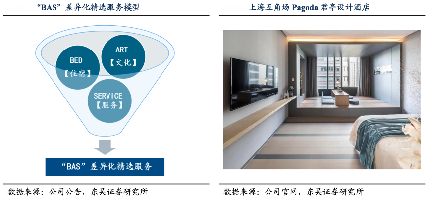 經(jīng)典案例:根據(jù)公司公告、公司官網(wǎng)、東吳證券研究所等綜合資訊表明,君亭首創(chuàng)“BAS”模式,提供差異化精選服務(wù)。“BAS”模型即“Bed 住宿+Art 文化 藝術(shù)+ Service 服務(wù)”三位一體,以產(chǎn)品為基礎(chǔ),不斷提升品牌及體驗(yàn)。君亭立足于“BAS” 模式,形成“產(chǎn)品精選、文化精選及服務(wù)內(nèi)容精選”的君亭特色服務(wù)體系。