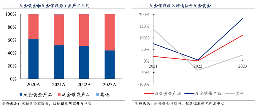 經(jīng)典案例:根據(jù)老鋪黃金招股書、信達(dá)證券研究開發(fā)中心等綜合資訊表明,老鋪黃金公司產(chǎn)品主要分為足金黃金和足金鑲嵌兩大類,2023年營收占比分別為 43.9%/56.0%,其中足金鑲嵌品類得益于 2019 年公司首度推出的黃金鑲鉆產(chǎn)品系列表現(xiàn)亮眼,收入占比從 2020 年的 38.5%持續(xù)提升至 2023 年的 56.0%、占比過半。2021-2023 年收入增速持續(xù)快于足金黃金類產(chǎn)品。