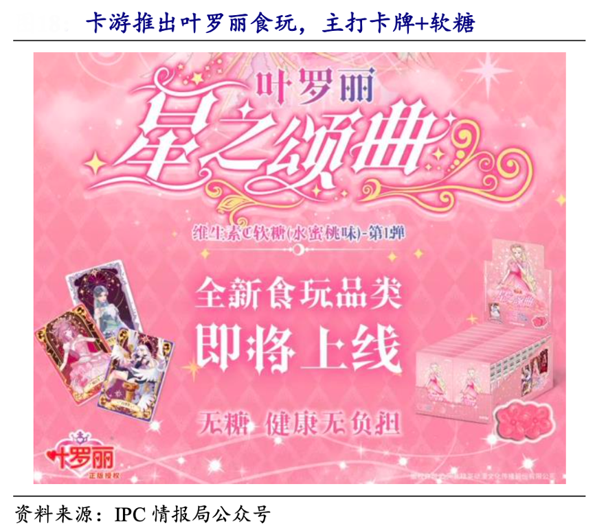 經(jīng)典案例:根據(jù)IPC情報(bào)局公眾號、開源證券研究所等綜合資訊表明,卡游在2024 年 7 月卡游向經(jīng)銷商發(fā)布了一則關(guān)于“將推出食玩類產(chǎn)品” 的公告,以提醒尚未有食品銷售資質(zhì)的經(jīng)銷商增加相關(guān)類目,從而更好地推進(jìn)商品銷售。首款食玩類產(chǎn)品“葉羅麗·星之頌曲·維生素 C 軟糖 (水蜜桃味)-第一彈”已上線。