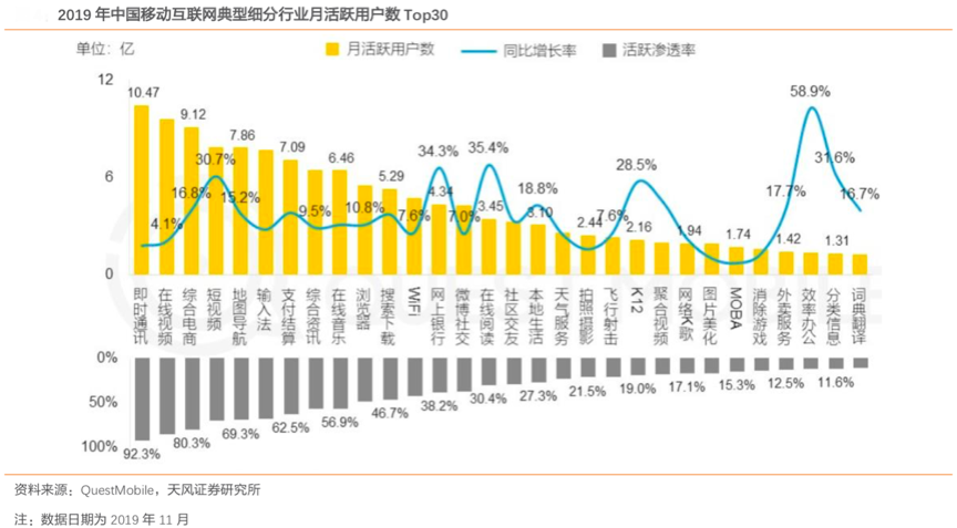根據(jù)QuestMobile、天風證券研究所等綜合資訊表明,2019 年 11 月國內(nèi)移動電商行業(yè)月活躍用戶達 9.12 億,同比增長 16.8%,對應移動端用戶的月活躍滲透率達 80.3%,僅次于即時通訊與在線視頻。用戶增長的天花板隱約可見,我們已經(jīng)進入了“存量競爭時代”,用戶精細化運營時代到來。
