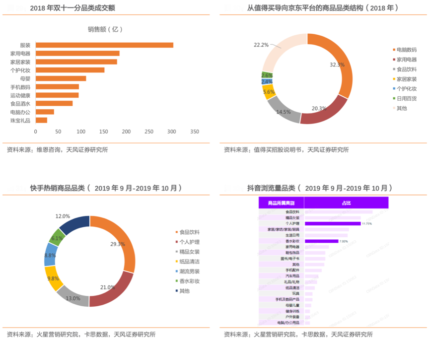 新零售電商企業(yè)所處平臺不同,其“品類矩陣構(gòu)建”有自己的特色,因互聯(lián)網(wǎng)平臺不同而具有不同品類結(jié)構(gòu)。據(jù)維恩咨詢、值得買招股說明書、火星營銷研究院、天風證券研究所等綜合資訊表明,以阿里、京東等為代表的傳統(tǒng)電商類平臺,其核心交易品類集中在服裝、3C家電、家居家裝等品類,而以快手、抖音等為代表的流量分發(fā)內(nèi)容平臺,其核心品類則集中在食品飲料、美妝、日用品等相對價格更低的商品,流量匯聚更容易,商業(yè)變現(xiàn)更方便。