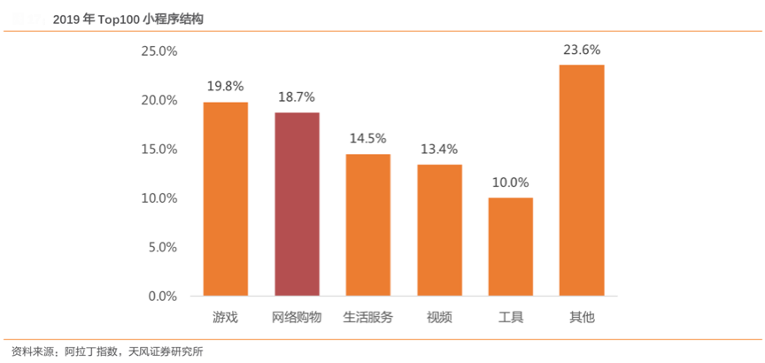 持續(xù)放大小程序價值,強化小程序的日常服務特性,積極融入游戲娛樂、網(wǎng)絡購物和生活服務等,提高小程序的日常使用頻率和使用滿意度。據(jù)阿拉丁指數(shù)、天風證券研究所等綜合資訊表明,2019年微信小程序發(fā)展迅速,用戶平均使用 60 個小程序,同比增長 100%,游戲和網(wǎng)絡購物類小程序深受歡迎, Top100 小程序中有近1/5 來自于電商行業(yè),這值得引起我們的關注。