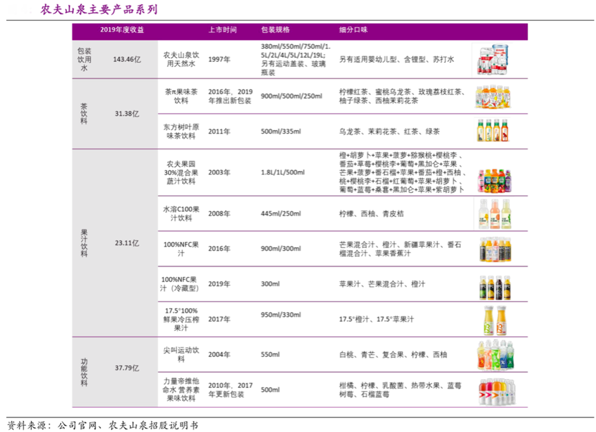 經(jīng)典案例:根據(jù)農(nóng)夫山泉招股說(shuō)明書等綜合資訊表明,農(nóng)夫山泉主要產(chǎn)品包括包裝飲用水以及飲料品類(茶飲料、果汁飲料等),包裝飲用水貢獻(xiàn)了60%以上的營(yíng)收;飲料品類中,農(nóng)夫果園、水溶 C100、 尖叫運(yùn)動(dòng)飲料是已運(yùn)營(yíng)持續(xù) 10 年以上的大單品。