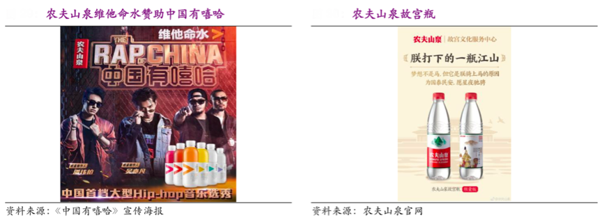 經(jīng)典案例:根據(jù)農(nóng)夫山泉招股說(shuō)明書等綜合資訊表明,農(nóng)夫山泉與中國(guó)有嘻哈、偶像練習(xí)生等節(jié)目合作,2017 年 至 2019 年「力量帝維他命水」的復(fù)合增長(zhǎng)率超過(guò) 47%。同時(shí)公司與網(wǎng)易云音樂(lè)的「樂(lè)瓶」,以及「故宮瓶」等聯(lián)名活動(dòng)通過(guò)在水瓶標(biāo)簽中展現(xiàn)精選樂(lè)評(píng)、古畫、趣味文字等內(nèi)容,以“熱點(diǎn)話題”點(diǎn)亮品牌形象。