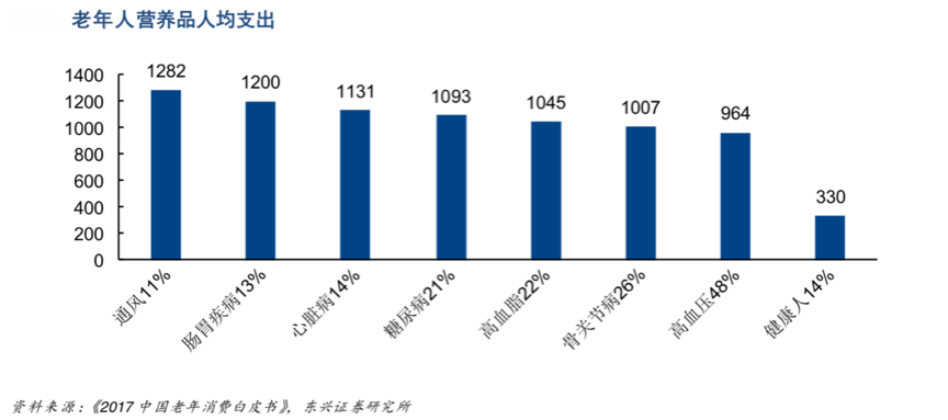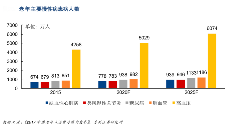 “老年人”普遍慢性病比較多,對(duì)疾病進(jìn)行診斷、治療和康復(fù)等是老年人普遍關(guān)注的話題,而老年人慢性疾病的患病率在逐年上升,管理慢性疾病的成本也在增加。根據(jù)東興證券等綜合資訊表明,在 60 歲以上的老年人口中,多種慢性病共存情況較為常見,其中,高血壓、腦血管疾病、糖尿病為主要病種,也是老年消費(fèi)人群關(guān)注的重要病種所在。