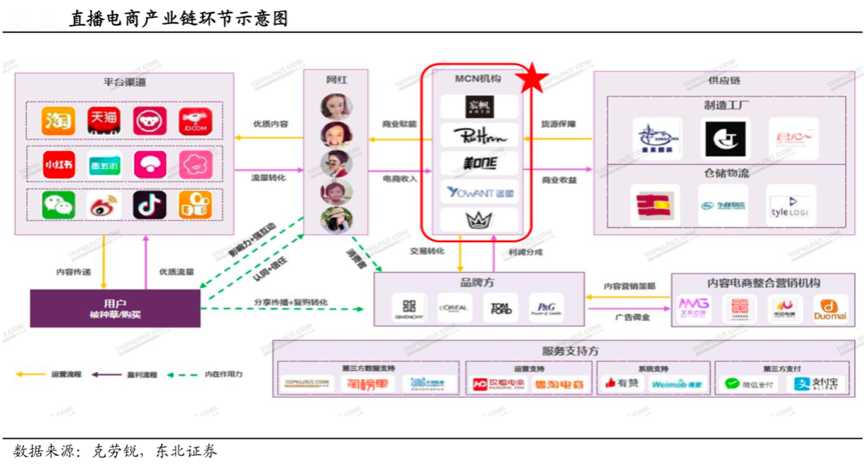 直播電商的“產(chǎn)業(yè)鏈經(jīng)營”蔚然成風,其產(chǎn)業(yè)鏈環(huán)節(jié)眾多,品牌商需要強化“直播產(chǎn)業(yè)鏈經(jīng)營”,關注主播價值挖掘、內(nèi)容營銷價值和服務支持機構的聯(lián)動等。根據(jù)克勞銳、東北證券等綜合資訊表明,直播電商產(chǎn)業(yè)鏈環(huán)節(jié)眾多,其包括平臺、用戶、主播、MCN機構、供應鏈、品牌方、內(nèi)容電商整合營銷機構和服務支持等共9個環(huán)節(jié),MCN機構在其中占據(jù)了關鍵性產(chǎn)業(yè)地位之一。