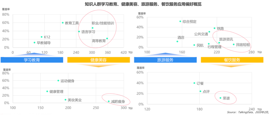 受知識人群歡迎的內(nèi)容有自己的特色及領(lǐng)域歸屬,構(gòu)建專業(yè)化、高價值的“品牌內(nèi)容池”就要重點(diǎn)關(guān)注這些內(nèi)容。根據(jù)TalkingData等綜合資訊顯示,知識人群追求對高等教育、語言學(xué)習(xí)、職業(yè)/技能培訓(xùn)類應(yīng)用有天生的好感,同時注重“個人旅游、身材管理等,運(yùn)動健身類應(yīng)用覆蓋率60%以上,這些內(nèi)容值得各企業(yè)重點(diǎn)關(guān)注、全面收集及重點(diǎn)分析。