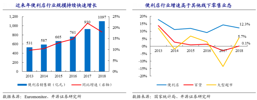 快捷高效的生活推動(dòng)了“便利消費(fèi)增長”,激發(fā)了社會(huì)化服務(wù)需求,渠道轉(zhuǎn)化率進(jìn)一步提高。根據(jù) Euromonitor 數(shù)據(jù)顯示,2018年國內(nèi)便利店行業(yè)規(guī)模達(dá)1097億元,2013-2018年復(fù)合增長率達(dá)15.6%。由于人口與家庭結(jié)構(gòu)的變化,越來越多的消費(fèi)需求在貼近居民的中小業(yè)態(tài)零售模式中得以滿足。同時(shí)根據(jù)國家統(tǒng)計(jì)局?jǐn)?shù)據(jù),2018 年便利店行業(yè)增速為 12.3%,連續(xù)多年高于百貨(增速 0.1%)與大型超市(增速5.7%)的 行業(yè)增速,成為線下零售業(yè)中增長最快的細(xì)分業(yè)態(tài)。