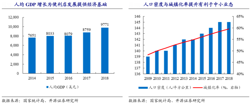 順時(shí)而進(jìn),憑借人口密度與城鎮(zhèn)化“東風(fēng)”大力推進(jìn),持續(xù)點(diǎn)亮零售消費(fèi)中“人”之商業(yè)價(jià)值。根據(jù)國家統(tǒng)計(jì)局、開源證券研究所等綜合資訊表明,2018年中國人均 GDP 超9000美元,居民收入增長驅(qū)動(dòng)行業(yè)消費(fèi)升級(jí),消費(fèi)者即時(shí)性需求的增加將支撐便利店行業(yè)高速增長。2018 年,中國人口密度達(dá)到 145 人/平方公里并保持增長態(tài)勢(shì),國內(nèi)城市人口密度已達(dá)到 2546 人/平方公里。