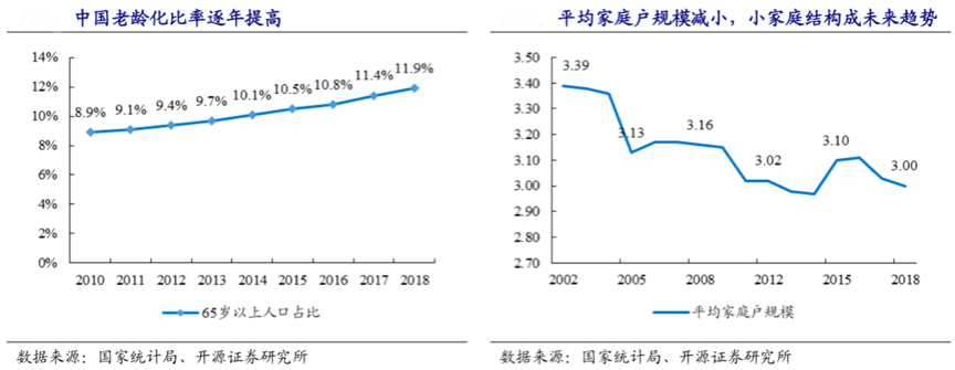 “老齡社會(huì)”逐漸形成,“泛生活精品品類”倍受追捧。從國內(nèi)數(shù)據(jù)看,老齡人口比例逐年上升、出生人口率下降,我國已逐漸步入老齡化社會(huì)。根據(jù)國家統(tǒng)計(jì)局、開源證券研究所等綜合資訊表明,2018年我國平均家庭戶規(guī)模為3.00 人,近年來持續(xù)下滑,小家庭結(jié)構(gòu)將成為未來家庭結(jié)構(gòu)的趨勢(shì)。大賣場(chǎng)、超市等傳統(tǒng)大業(yè)態(tài)的購物流量受到攔截,而以便利店或社區(qū)生鮮店為典型、滿足消費(fèi)者一日三餐需求為目標(biāo)的社區(qū)化中小業(yè)態(tài)將得到更大的發(fā)展機(jī)會(huì)。