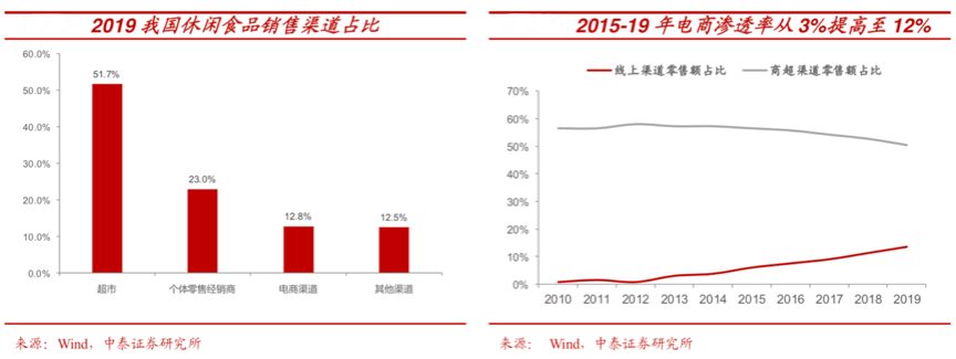 90后等年輕世代日益成為休閑食品的消費(fèi)主力人群,網(wǎng)絡(luò)購(gòu)買、電商交易等消費(fèi)習(xí)慣驅(qū)動(dòng)休閑食品消費(fèi)向各年齡層次滲透。內(nèi)容電商、直播電商等多元化電商銷售場(chǎng)景紛紛涌現(xiàn),推動(dòng)著休閑食品策劃經(jīng)營(yíng)的快速增長(zhǎng)。根據(jù)wind、中泰證券研究所等綜合資訊表明,2019年我國(guó)休閑食品銷售渠道占比仍以超市(51.7%)、個(gè)體零售經(jīng)銷商(23%)、電商渠道(12.8%)等為主,同時(shí)電商滲透率從3%升至12%,食品電商發(fā)展迅猛。