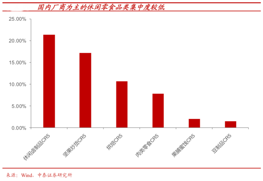 休閑食品行業(yè)目前仍然處于品類分散的狀態(tài),大量的休閑食品細(xì)分品類集中度較低,各細(xì)分品類“領(lǐng)導(dǎo)品牌/唯一品牌/領(lǐng)先品牌”的“戰(zhàn)略性機(jī)會(huì)”依然存在。根據(jù)wind、中泰證券研究所等綜合資訊表明,行業(yè)集中度較低的休閑鹵制品、堅(jiān)果炒貨、烘焙糕點(diǎn)子行業(yè)CR5 分別為21.4%、17.2%、11.3%,行業(yè)集中度提升空間大;而膨化食品、糖果巧克力、餅干行業(yè)子行業(yè)CR5分別為69.4%, 47.5%,30%,外企龍頭已提前占領(lǐng)市場(chǎng)及渠道,集中度繼續(xù)提升空間較小,相對(duì)的行業(yè)進(jìn)入壁壘較高。分品類的休閑食品“王者誕生”的機(jī)會(huì)依然處處,商機(jī)處處,價(jià)值處處。